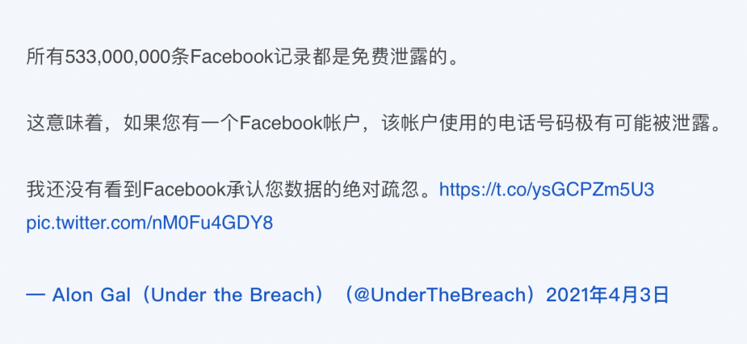 2019年4月,UpGuard Cyber Risk团队透露,两个第三方Facebook应用数据集已经暴露在公共互联网上。墨西哥的媒体公司Cultura Colectiva称,高达146GB,包含超过5.33亿条记录,详细记录了评论、点赞、反应、账户名称、FB ID等。考虑到此类数据的潜在用途,这种以同样集中形式进行的同一类型的数据泄露事件,在最近引起了广泛关注。