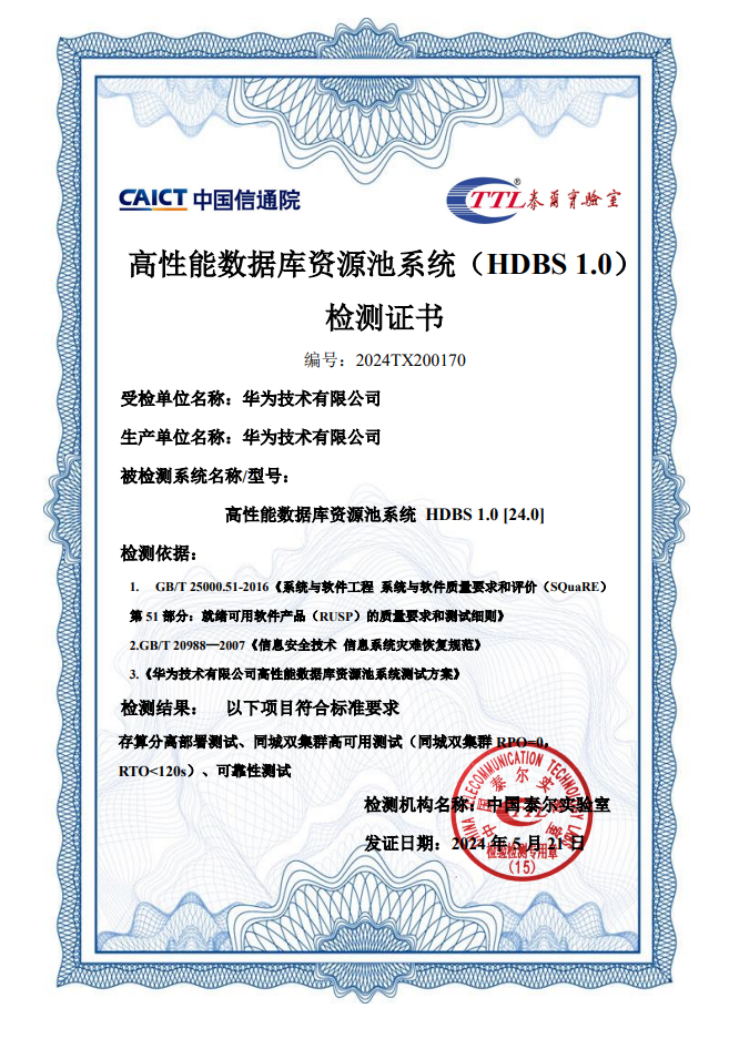 此次验证,依据《系统与软件工程 系统与软件质量要求和评价(SQuaRE) 第51部分:就绪可用软件产品(RUSP)的质量要求和测试细则》标准和《信息安全技术 信息系统灾难恢复规范》标准开展,评价指标覆盖3大类17项测试项目,重点验证华为高性能数据库资源池方案HDBS在高可用和可靠性两个方面的表现,测评结果证明,HDBS的可用性和可靠性都处于业界领先水平。