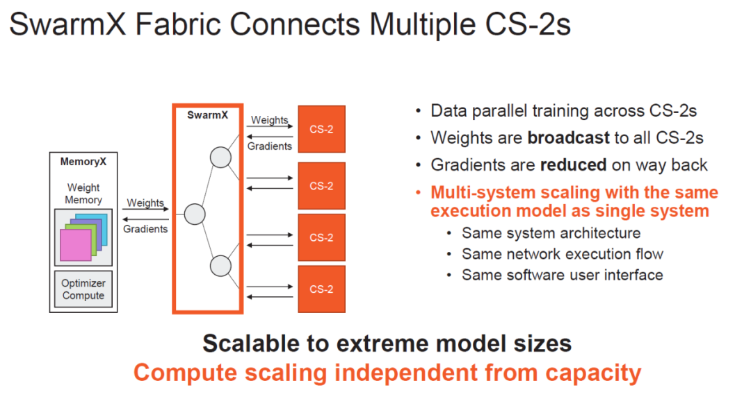 继续从分布式AI训练集群来看,对内存池的需求主要是一个是训练数据集的分发和混淆,另一个是参数和梯度的更新。所以这次HotChip中Cerebras提供了一个Memory-X套件: