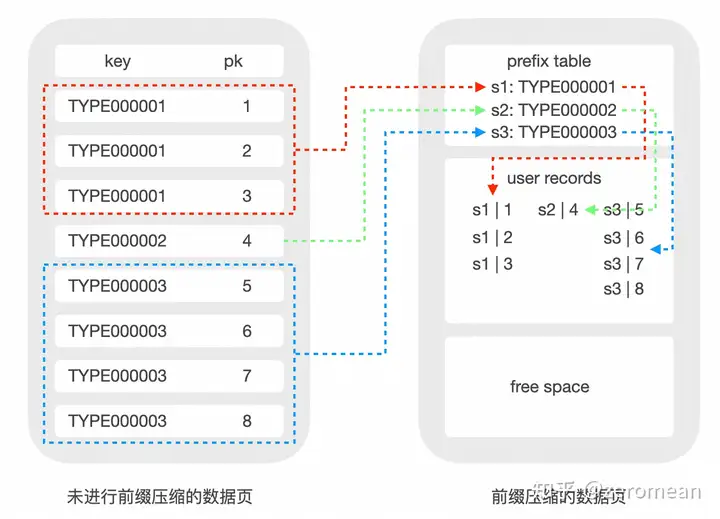 前缀压缩其实有多种具体实现,比如同个 Page 的 record 前缀重复出现部分的直接压缩,如前缀为 "aaaaa" 直接压缩为 "a5";或相对前一记录重复部分的压缩,又或相对具体元素的前缀重复部分,提取 "aaaaa" 到公共区域作为前缀。