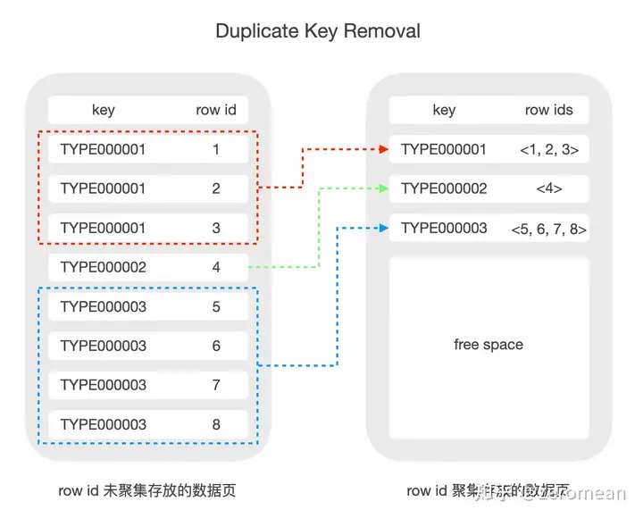 值得一提的是,部分商业数据库在实现 non-unique index 时,一般会将相同的二级索引对应的主键索引聚集存放, 这样二级索引 key 部分的数据只需要存一份(Duplicate Key Removal)。而在 InnoDB 中的实现较为简单, 每个二级索引 record 为重复的二级索引 key 字段加不同主键 key,这加剧了 InnoDB 索引数据膨胀的问题。