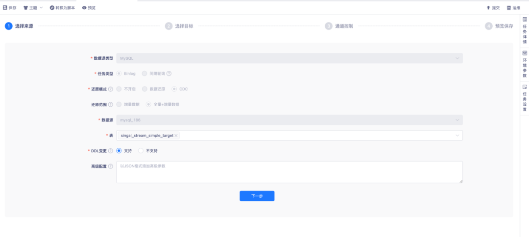 首先,对数据库表进行全表快照读取,生成数据的一致性快照,以同步来源表的历史全量数据。在全量快照读取完成后,会自动切换至增量模式,对数据库的增量变化进行采集。表选择的方式多样,支持整库同步、分库分表同步、单表选择同步,同时也支持通过正则的方式选择表。