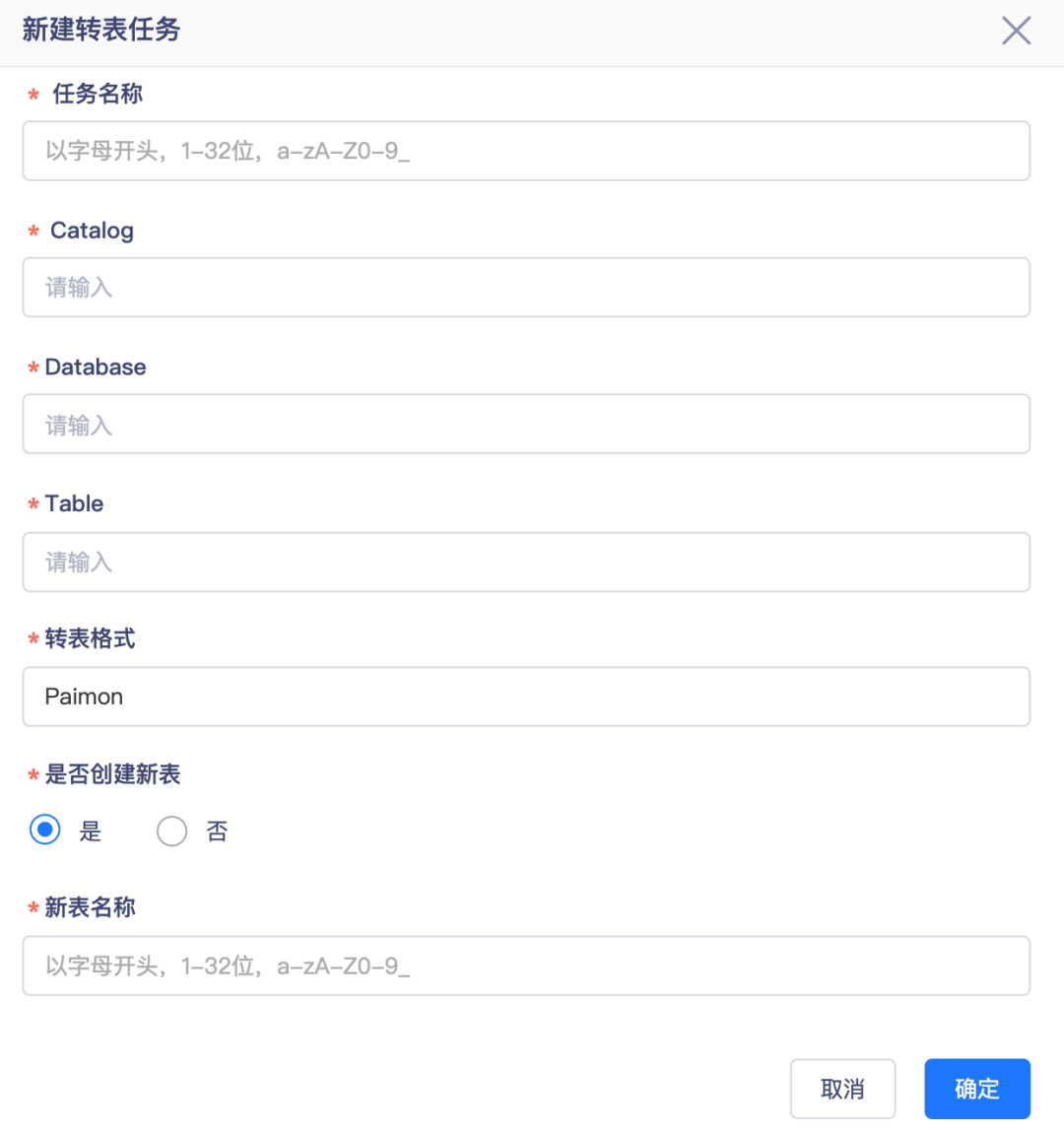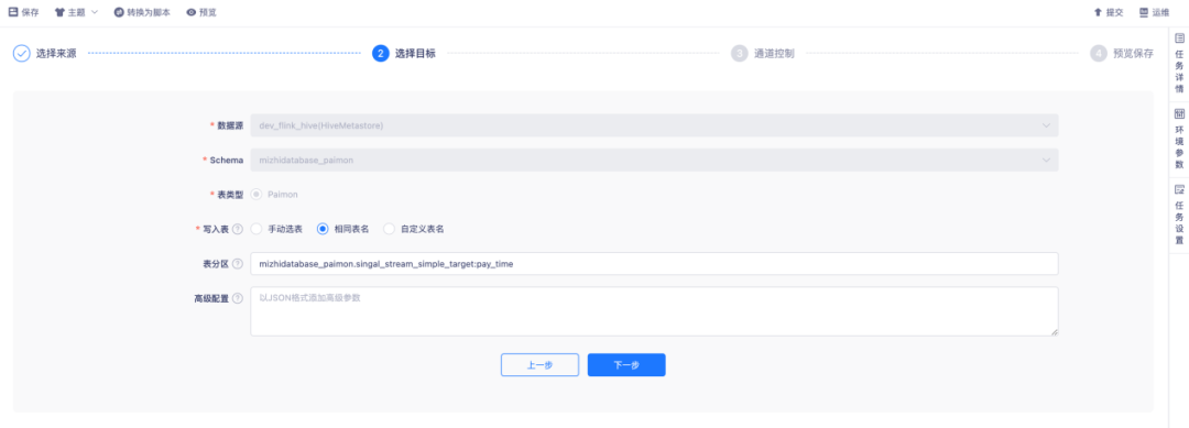 目标源通过 HiveMetastore 方式配置目标 Paimon 表。写入表的方式具有一定灵活性,支持手动选择表。对于上游存在多表写入同一下游表的场景,有一定要求,必须保证上下游表结构保持一致。