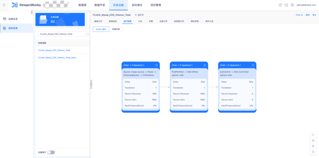 实时采集任务在通过语法检查后,提交至调度运维中运行。采集任务的指标包括 Mertic 输入输出指标展示、脏数据指标以及数据血缘解析等。