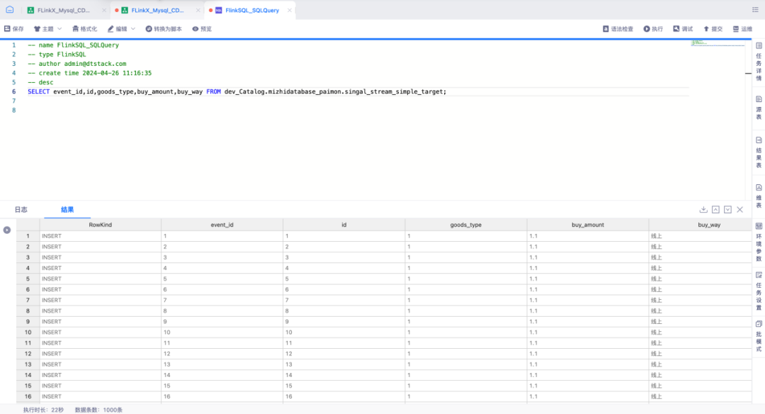 通过实时平台中 FlinkSQL 任务所提供的功能,对 Paimon 表进行查询并插入数据。利用 FlinkSQL 的 SqlQuery 功能构建 Select 查询语句,并采用流模式实时查询 Paimon 表,以采集插入数据的情况。