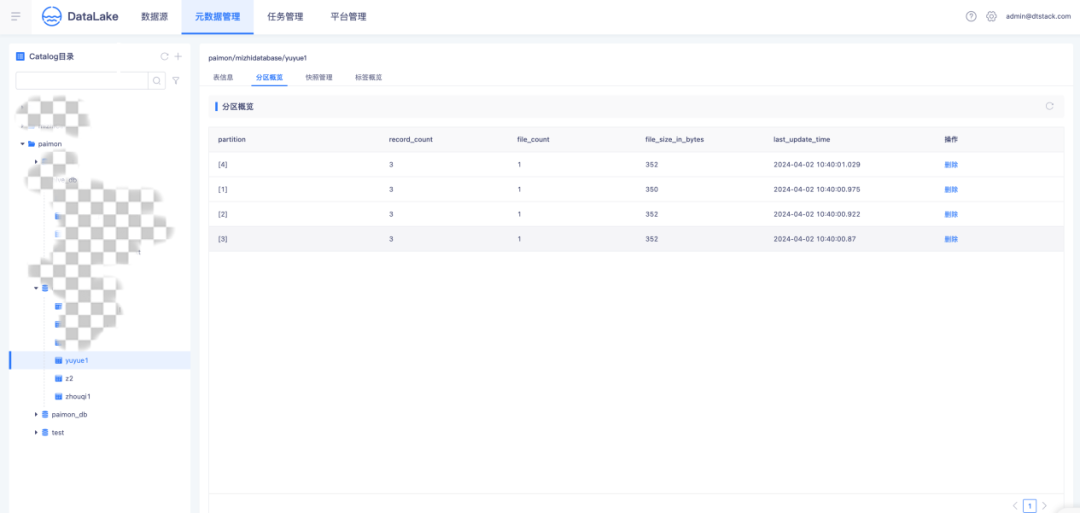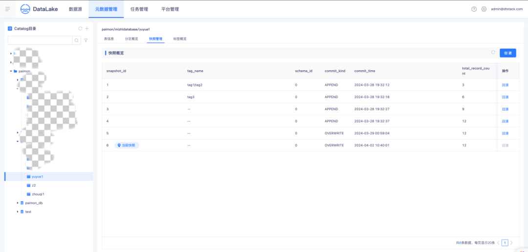 快照记录了一个表在某一特定时间点的状态。用户能够借助最新的快照获取一个表的最新数据。利用时间旅行,用户还可以通过较早的快照访问表的先前状态。快照概览展示了当前表的所有快照、最新 snapshot,支持手动创建标签并在列表中展示引用关系,同时支持快照的删除和回滚操作。