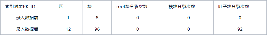 - • 从索引的分裂情况来看,在录入数据之前,索引PK_ID分配了一个区,这个区有8个块,但实际上只使用了一个块