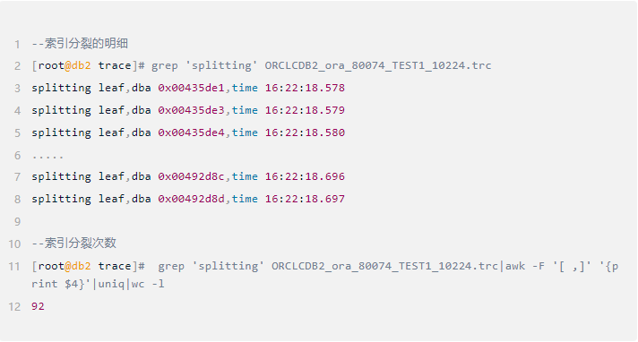 观察到插入数据之后,产生了92次索引叶子块分裂,且分裂类型均为9-1单边分裂类型。