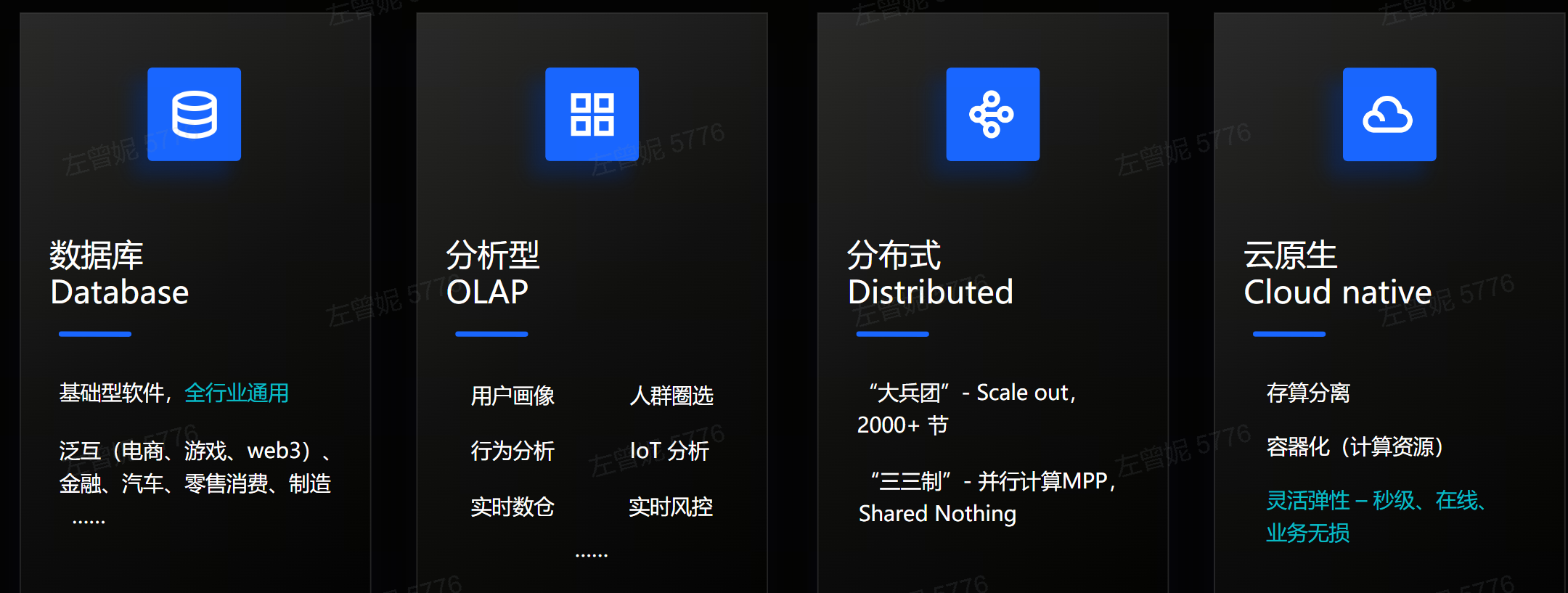 总结来看,卓越性能能够快速处理海量数据,在各个场景中实现高效运算;秒级无损弹性弹性,使成本更加可控,更具性价比;一体化架构,将数据处理的各个环节紧密融合,从智能化、轻量化角度增强产品能力,减少用户操作成本;全场景覆盖,能规避“七国八制”现象,最大化数据效能;生态多元化,则能与众多不同类型的技术和产品良好兼容,形成强大的生态体系,共同为用户提供更优质的数据服务。