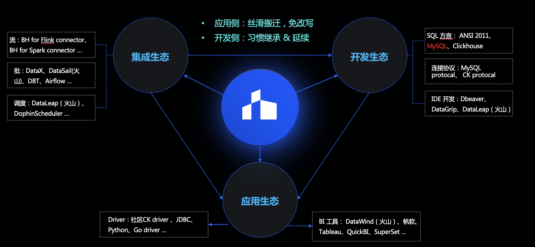第五个核心能力是生态多元化。OLAP 领域虽然呈现出百花齐放的局面,但主流还是存量场景。为了让更多用户开发者和应用用户从其他平台顺滑迁移到 ByteHouse ,ByteHouse期望能尽量缩减改写和搬迁代价。
