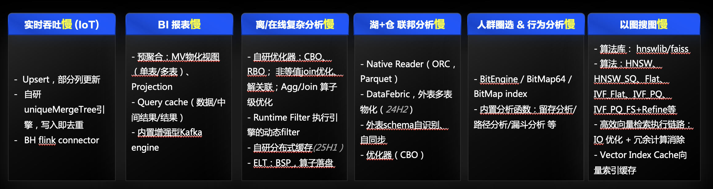 最为首要且关键的核心能力是性能。在 OLAP 领域,性能是一个永恒的追求。在下图的六个场景中,都存在着各种性能问题。