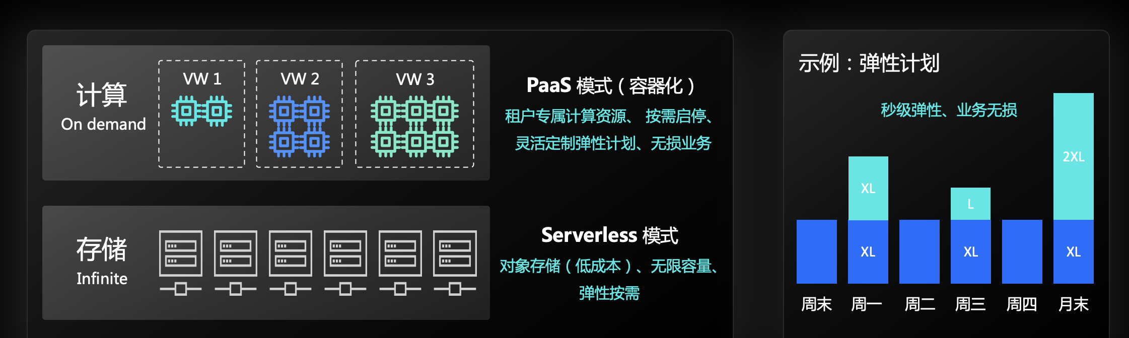 第一个收益是弹性灵活。计算资源基于容器化的 stateless 能实现秒级的弹性。存储方面,ByteHouse则可以做到按需无限容量的弹性。
