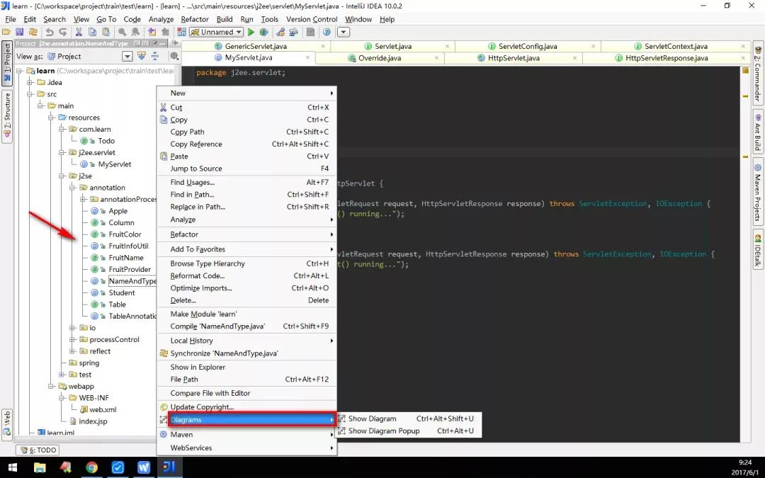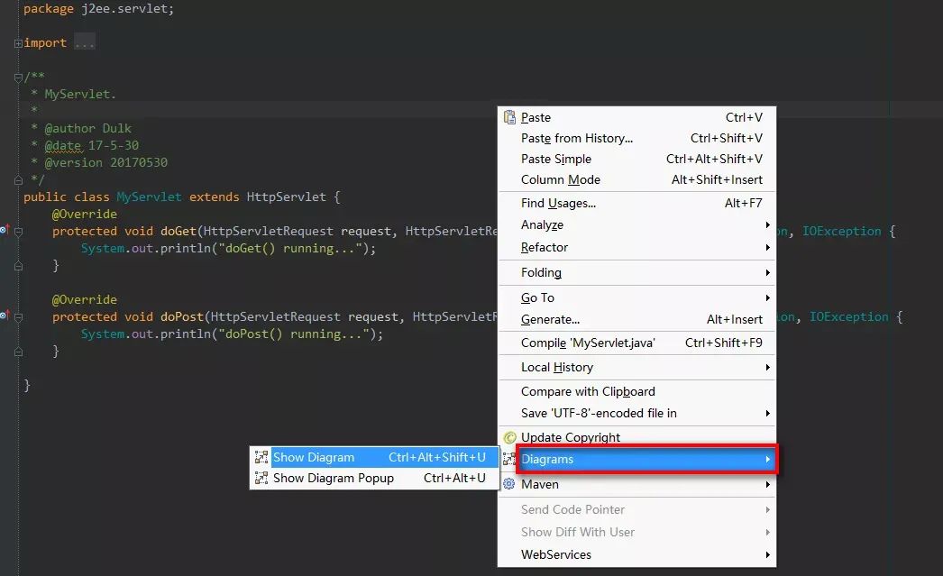 实际上,你也可以从左边的项目目录树中,对你想查看的类点击右键,同样选择Diagrams,效果是一样的:
