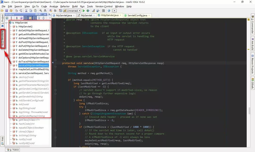 在进入某个类后,如果还想快速地查看该类的其他方法,还可以利用IDEA提供的structure功能: