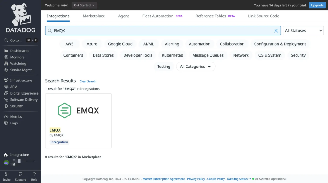 EMQX 提供了开箱即用的 Datadog 集成(https://docs.datadoghq.com/integrations/emqx/),您可以使用如下步骤,将其添加到您 Datadog 控制台中: