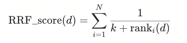 这里,𝑁 代表不同召回路的数量,rank𝑖(𝑑) 是第 𝑖 个检索器对文档 𝑑 的排名位置,𝑘 是一个平滑参数,通常取 60。