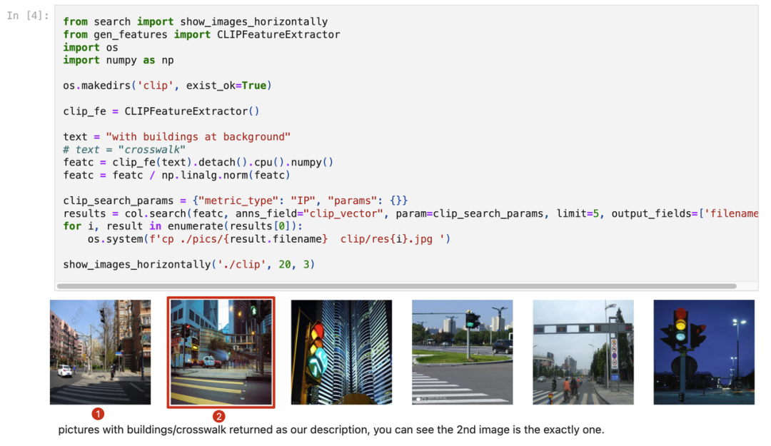 然后我们来看另外的一路单列搜索,由于 CLIP 模型的跨模态理解能力,我们可以通过输入文本来搜索图片,这里的搜索 text 是 "with buildings at background"。
