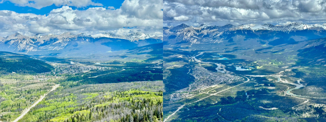 因为整个国家公园区域内禁止飞无人机,所以这种登高望远的景色是独一无二的。一望无际的雪山尽收眼底,俯瞰整个 Jasper 小镇,碧绿翠蓝如同宝石一般的湖泊,那种震撼人心的美,我觉得二维照片是很难表现出来的。