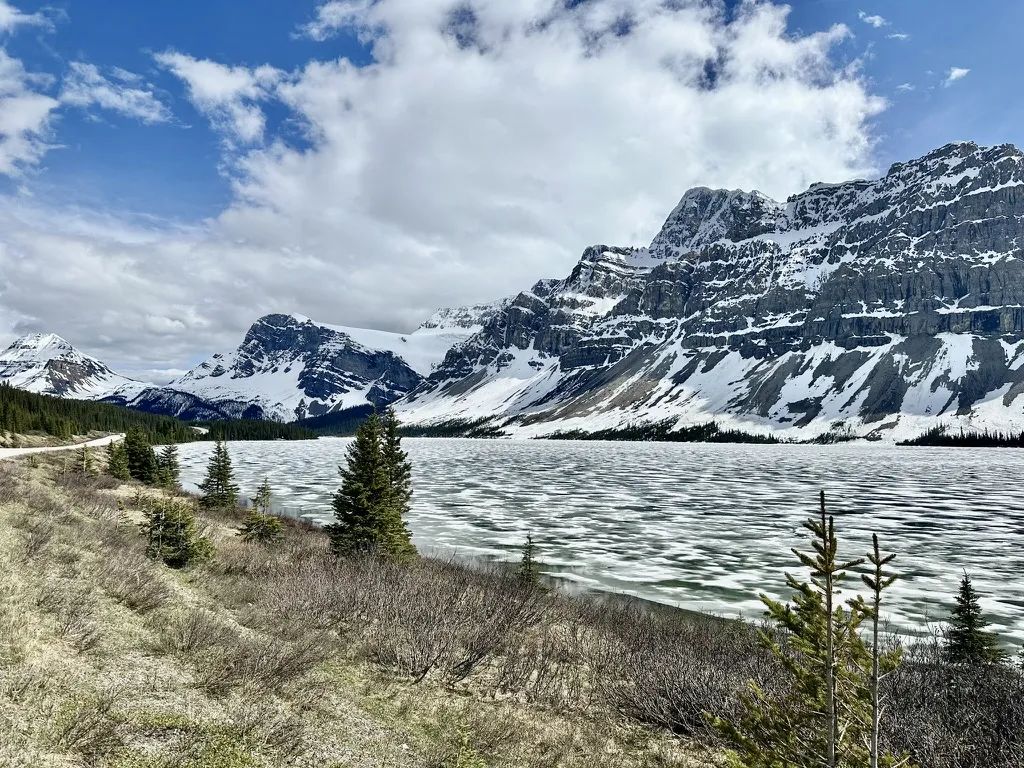 过了哥伦比亚冰原的分水岭之后,河水的流向就调了个个。沿着河与路向南走,第一个知名的景点就是 Bow Lake,不幸地是,我去的时候弓湖还没有完全化冻。