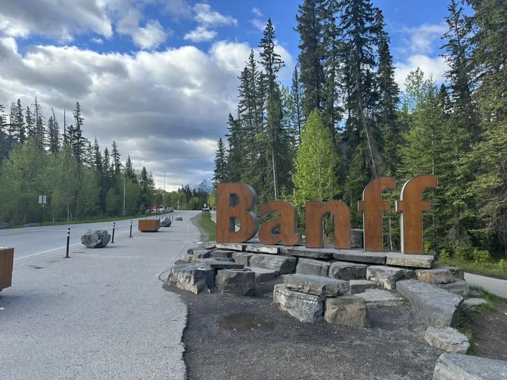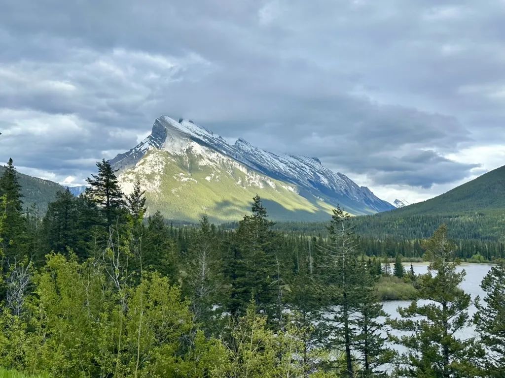 不过明天才能入住,今天车也不让开进去。那么今天住哪儿呢?就去班夫小镇住吧。从路易斯湖离开后,开车前往班夫,这里是班夫著名标志性的兰德尔山 —— 从朱砂湖望去,蔚为壮观。