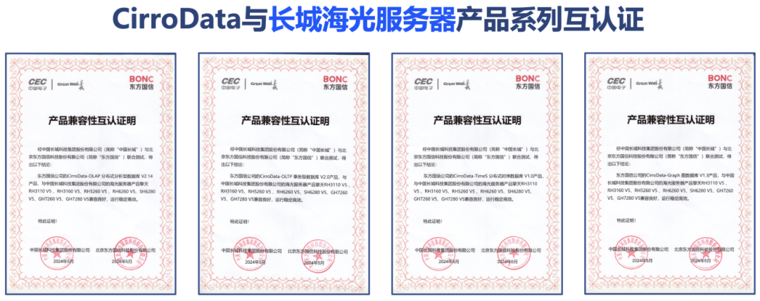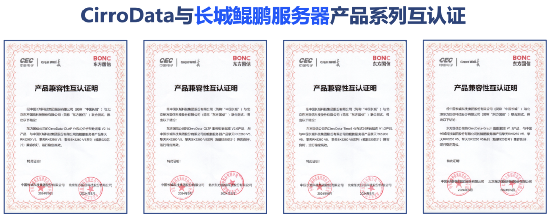 本次兼容适配,东方国信CirroData的四款数据库,CirroData-OLAP分析型数据库、CirroData-OLTP交易型数据库、CirroData-TimeS时序数据库与CirroData-Graph图数据库分别与长城擎天RK系列服务器(鲲鹏处理器)和长城擎天RH系列服务器(海光处理器)进行联合测试,双方产品全面适配,为今后的生态合作与市场合作奠定了基础,双方也将共同推动为各行业客户提供安全可靠的数字化转型基础软硬件产品与解决方案。