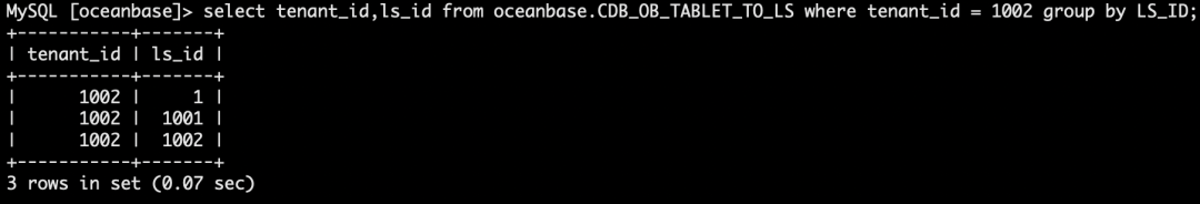 select tenant_id,ls_id from oceanbase.CDB_OB_TABLET_TO_LS where tenant_id = 1002 group by LS_ID;