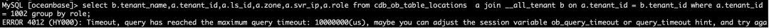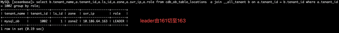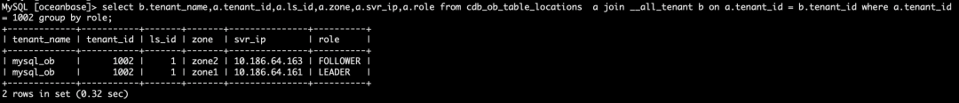 select b.tenant_name,a.tenant_id,a.ls_id,a.zone,a.svr_ip,a.role from cdb_ob_table_locations a join __all_tenant b on a.tenant_id = b.tenant_id where a.tenant_id = 1002 group by role;