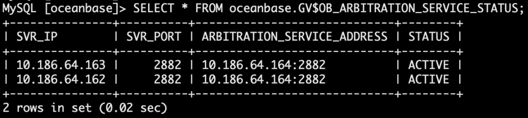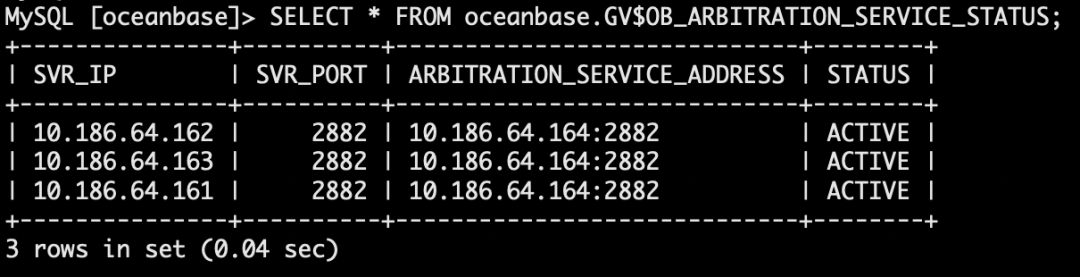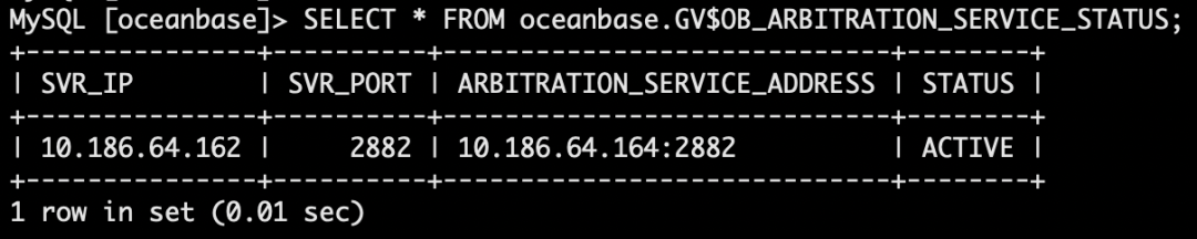 SELECT * FROM oceanbase.GV$OB_ARBITRATION_SERVICE_STATUS;