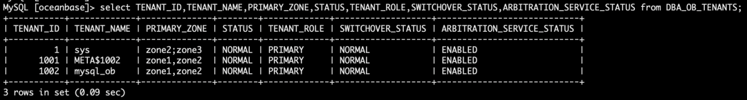 select TENANT_ID,TENANT_NAME,PRIMARY_ZONE,STATUS,TENANT_ROLE,SWITCHOVER_STATUS,ARBITRATION_SERVICE_STATUS from DBA_OB_TENANTS;