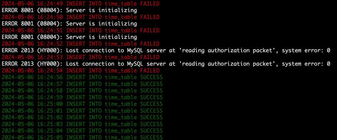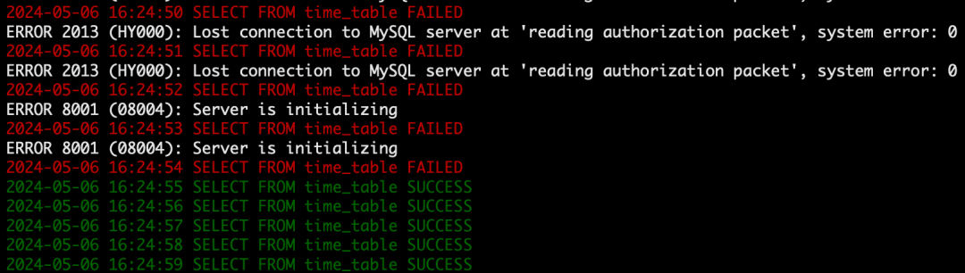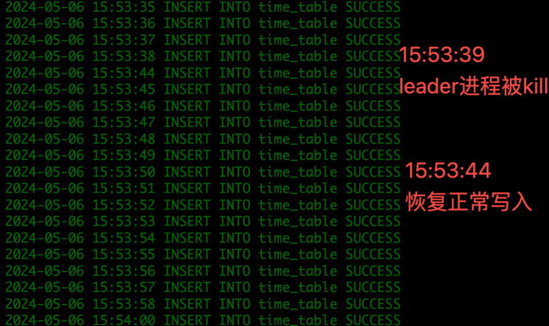 调成 60s2024-05-06 15:53:39 kill 掉 161 节点全能型副本节点(leader) 2024-05-06 15:53:39 ~ 15:53:43 约持续 5s,insert 脚本未写入数据,select 脚本未读到数据 leader 节点由 161 切至 163 2024-05-06 15:53:43 161节点触发日志流降级,原因:CRASHED_OR_BROKEN_NETWORK 2024-05-06 15:54:39 161 节点被标记永久下线 2024-05-06 16:04:28 kill 掉 163 节点全能型副本节点(新 leader) 2024-05-06 16:04:28 租户开始进入读写异常状态 确认两个全能型副本状态都为:INACTIVE 仲裁服务节点与 2 个异常节点联通异常 2024-05-06 16:05:35 163 节点被标记永久下线 租户处于无主状态 2024-05-06 16:22:53 启动 163 节点全能型副本节点(后被 kill,先启动) 2024-05-06 16:24:55 租户恢复正常读写 2024-05-06 16:36:29 启动 161 节点全能型副本节点 将永久下线时间参数 server_permanent_offline_time