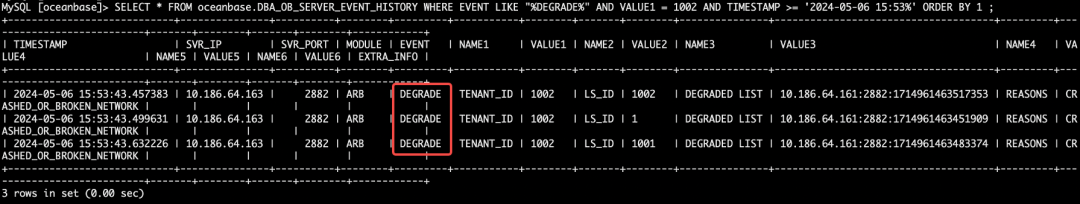 SELECT * FROM oceanbase.DBA_OB_SERVER_EVENT_HISTORY WHERE EVENT LIKE "%DEGRADE%" AND VALUE1 = 1002 AND TIMESTAMP >= '2024-05-06 15:53%' ORDER BY 1 ;