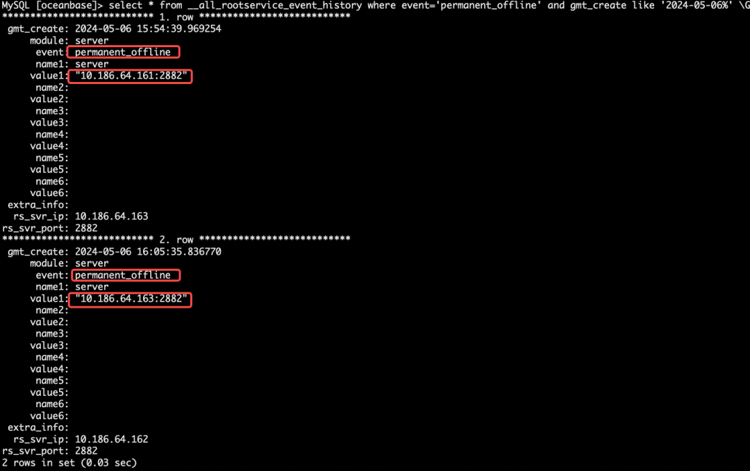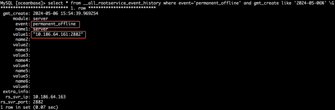 select * from __all_rootservice_event_history where event='permanent_offline' and gmt_create like '2024-05-06%' \G