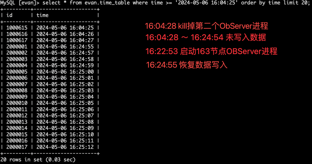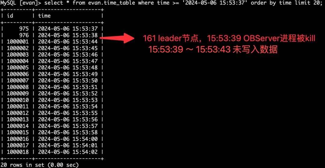 查询 kill 掉第 2 个 observer 时间点前后,业务表 time_table