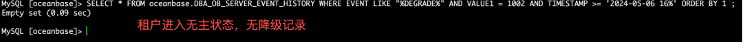 SELECT * FROM oceanbase.DBA_OB_SERVER_EVENT_HISTORY WHERE EVENT LIKE "%DEGRADE%" AND VALUE1 = 1002 AND TIMESTAMP >= '2024-05-06 16%' ORDER BY 1 ;