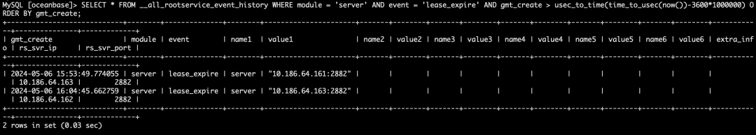 SELECT * FROM __all_rootservice_event_history WHERE module = 'server' AND event = 'lease_expire' AND gmt_create > usec_to_time(time_to_usec(now())-3600*1000000) ORDER BY gmt_create;