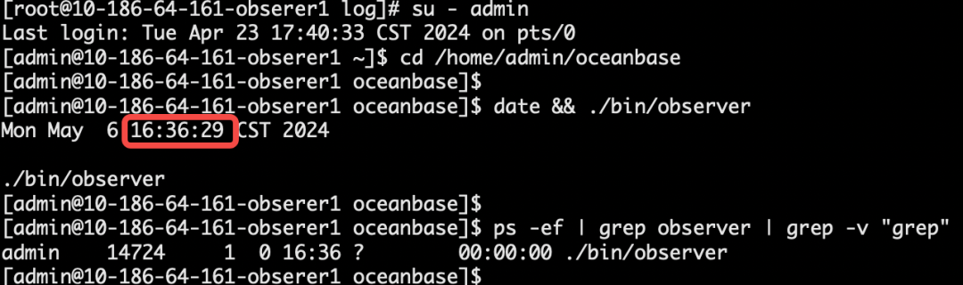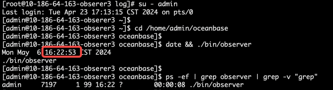 由于此时租户已经不满足多数派,处于故障状态,我们应该先启动故障时间较晚的 OBServer 节点,再启动故障时间较早的 OBServer 节点。(通过 observer.log