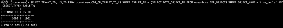 SELECT TENANT_ID, LS_ID FROM oceanbase.CDB_OB_TABLET_TO_LS WHERE TABLET_ID = (SELECT DATA_OBJECT_ID FROM oceanbase.CDB_OBJECTS WHERE OBJECT_NAME ='time_table' AND OBJECT_TYPE='TABLE');
