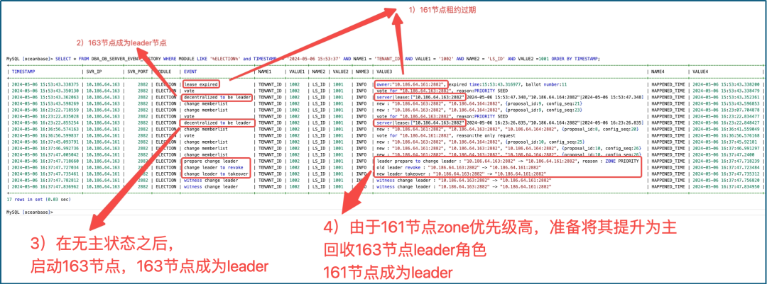 SELECT * FROM DBA_OB_SERVER_EVENT_HISTORY WHERE MODULE LIKE '%ELECTION%' and TIMESTAMP >= '2024-05-06 15:53:37' AND NAME1 = 'TENANT_ID' AND VALUE1 = '1002' AND NAME2 = 'LS_ID' AND VALUE2 =1001 ORDER BY TIMESTAMP;