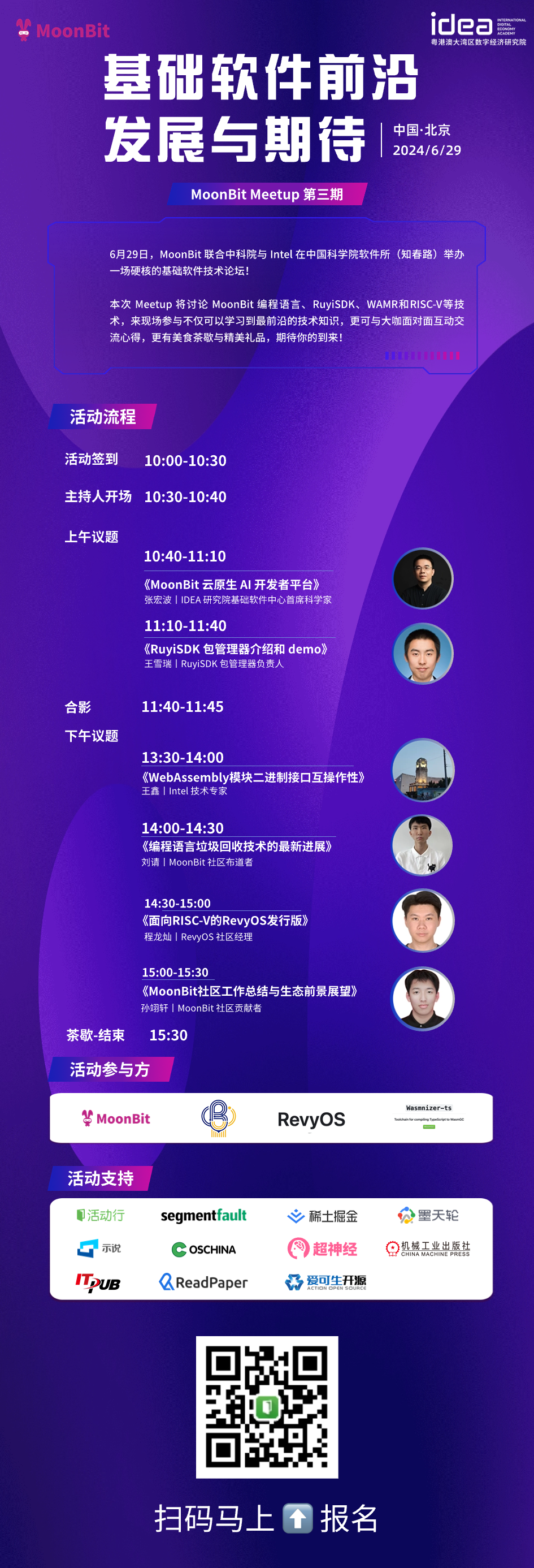 本次 Meetup 将讨论 MoonBit 编程语言、RuyiSDK、WAMR和RISC-V等技术,来现场参与不仅可以学习到最前沿的技术知识,更可与大咖面对面互动交流心得,还有美食茶歇与精美礼品,期待你的到来!2、线上同步直播(后续会在公众号上发布视频号预约入口)6月29日(周六) 10:30 am — 3:30 pm北京市海淀区中关村南四街四号院五号楼裙楼 4 层大报告厅