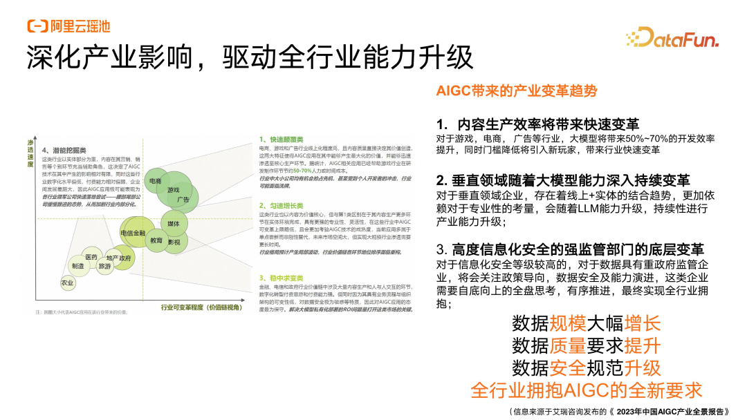 对于那些价值链线上化程度越高,内容在价值链中占比越高的企业,它们对 AI 的拥抱度往往更高,同时能够将大模型更快地应用到内容生产上,现在可以看到的情况是在生产效率上能带来 50% 到 70% 的提升。同时,对于海量数据的开发效率提升背后,支撑着的扫描的数据面积也会变得更大,生产的数据也会变得更多,随着大规模的大模型的使用,会带来整个数据处理面向应用内容生产上数据量的大幅增长。