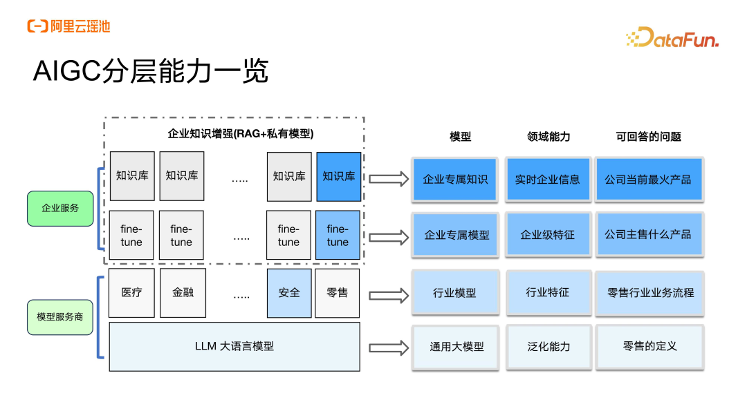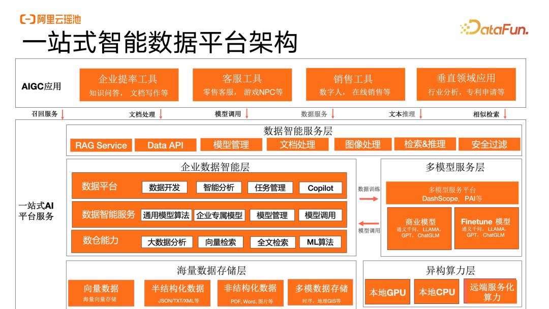 为了面向 AIGC 的业务和应用,我们将平台的数据能力向上浮了一层,也就是数据智能服务层,包括了 RAG Service、Data API、模型管理,同时也对文档处理、图像处理、检索推理和安全过滤等原子能力进行了覆盖,让上层应用能够更好地去直接访问中间的数据层。