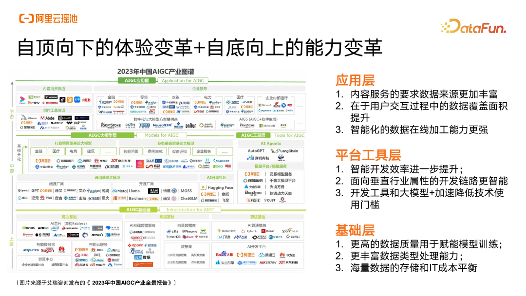 第二个是 AIGC 平台工具层。目前以 Copilot 和 NL2SQL 等基于语义检索的能力为主,重点还是面向开发者提升开发效率。同时也有一些垂直行业,比如数据标注和面向垂直领域的一些开发属性链路的智能化提升,帮助分析师和数据使用者能够通过大模型降低基础的门槛,提升效率。