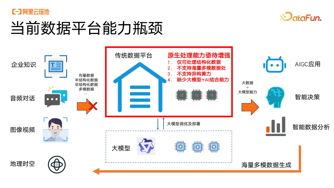 从 AIGC 行业趋势和数据平台能力的演进方向上看。目前企业数据平台能力面临的挑战主要集中在三个层面: