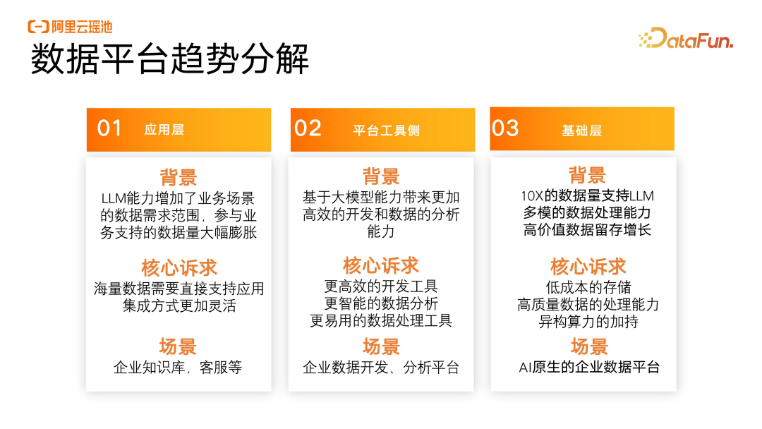 数据平台包含应用层、平台工具层和基础层。应用层的核心诉求是海量数据需要直接支持应用,集成方式更加灵活,比如企业的知识库、客服和 RAG 的一些场景。在平台工具层,我们希望把数仓的核心能力,比如数据分析能力、开发能力等和大语言模型进行结合,升级整体的能力。基础层则更多的是提供低成本的算力和存储。