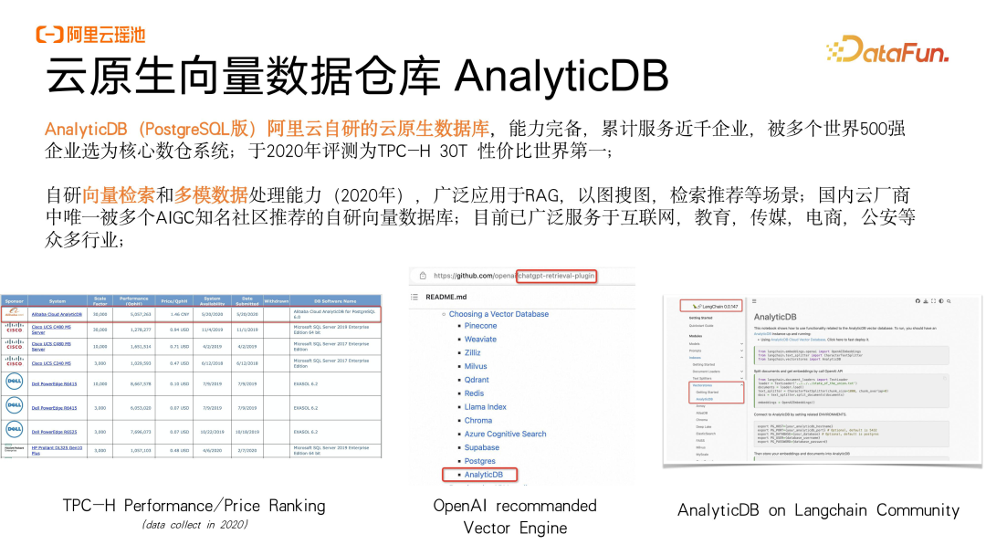 AnalyticDB是阿里云自研的云原生数据库,在数据仓库、语义检索、多模处理能力上面具备非常强的市场竞争力,被多个世界 500 强企业选为核心数仓系统。AnalyticDB 在 2020 年 TPC-H 30T 的评测结果为性价比世界第一,同时也是阿里云第一个被 OpenAI 的 Chatgpt-Retrieval-Plugin 项目推荐的向量数据库,也被 LangChain 等开源社区进行了集成。