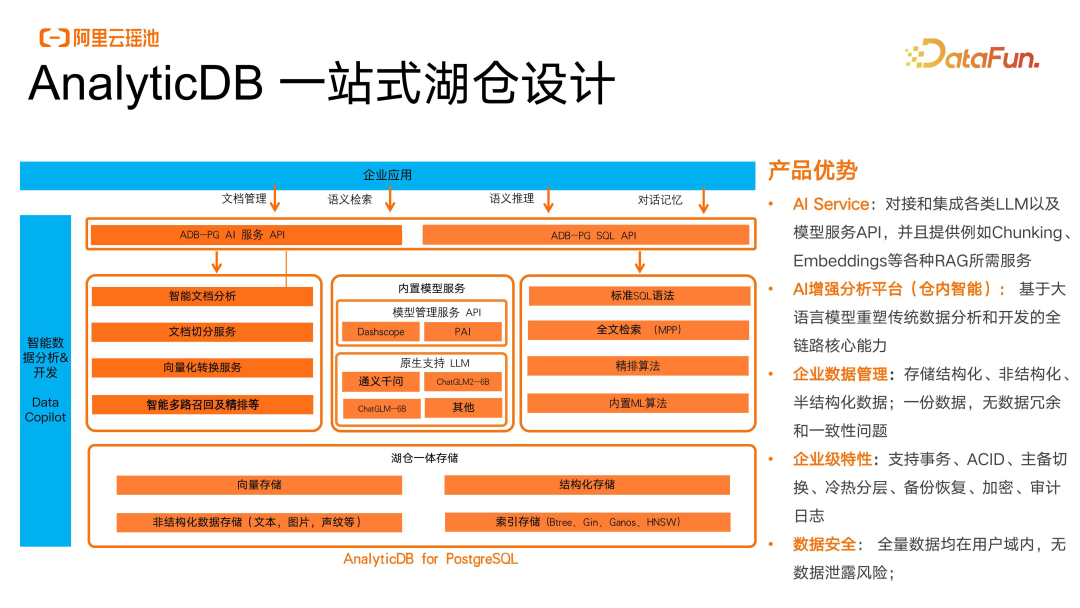 对于企业应用侧,我们通过 SQL API、服务 API,完成向量面向应用侧的加速和布局。并实现了在仓内通过内置的模型服务模块快速连接到自身企业部署的一些模型服务能力,同时将这些能力与原生的数据分析引擎进行了融合。所以无论是“通义千问”还是企业自己部署的私域模型,都可以直接在仓内进行数据的分析和检索,同时做一些非结构化数据的处理。底层湖仓一体的存储,我们通过分层对现有存储进行了解耦。配套的阿里云的数据库生态和开发工具,能够实现数据开发的Copilot在线支持,以及一站式自然语义的分析。