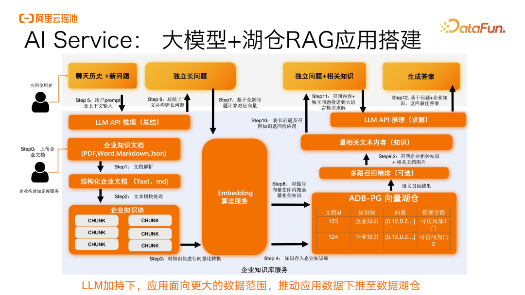 在面向应用侧的服务里面提供了一套 AI Service 的能力,包含了大模型和湖仓 RAG 的搭建。