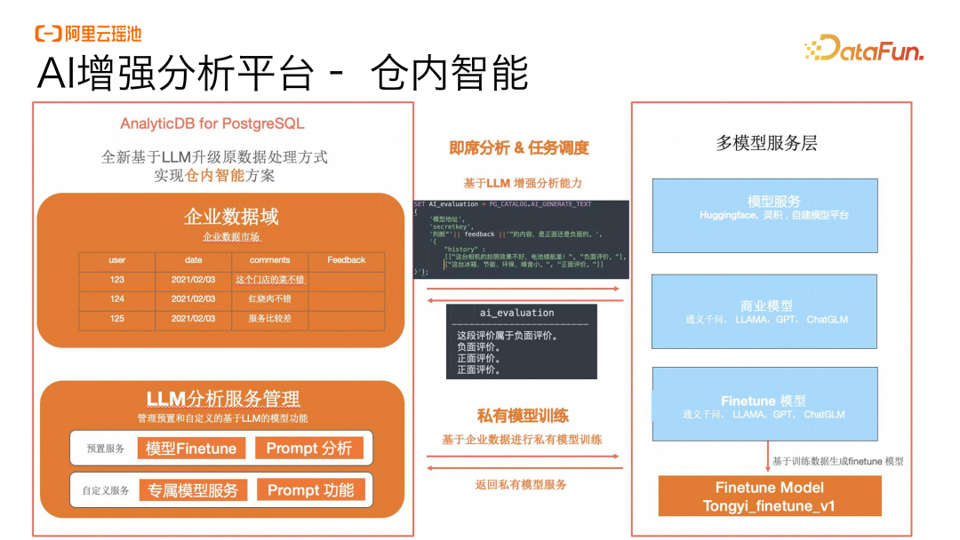 对于企业核心的数据层,在保有数据平台和数仓、数据湖能力之上,我们添加了在仓内进行数据模型直接调用的方式。相比于企业原来对于数据只是做一些标准算子的分析,现在能够支持企业在仓内、湖内实现叠加上大语言模型的一些增强的分析能力。举个简单的例子,比如在文本中提取用户的情感倾向、核心关注点或者客诉客情申请。原来我们无法在仓内或者湖内直接实现,通过引入大语言模型到数仓、湖内,现在可以直接去调用这些非结构化数据进行快速的情感倾向判断,提升数据服务能力。同时这些能力也能反哺成为 NL2SQL 的支撑,通过自然语言的理解进行用户 Intention 的判断,然后投递成 SQL,转换到仓内湖内进行分析。