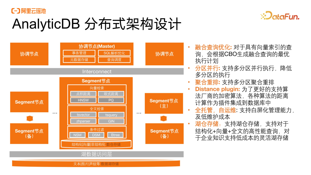 AnalyticDB采用的是分布式架构,在保有所有数据库能力的基础之上,支持所有语义相关的检索,包括了向量检索和全文检索。对于结构化向量和非结构化的全文检索,可以实现一站式的融合查询,并且通过 SQL 就可以直接实现语义查询。