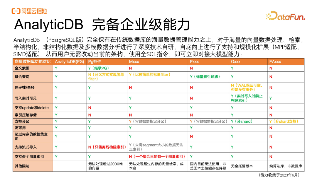 在实现了面向应用侧和自身的能力升级之外,AnalyticDB 保有了完备的企业级能力,包括写入事务的原子性。比如在做 AI 面向应用的支持时,对于语义查询存在的多路召回,可以在保证多路同时更新之后相关的事务才能被找到。同时它也是实时离在线一体的,对于实时数据写入、批量写入都可以支持不同接入方式和整套的update、delete操作。在高可用方面,可以同时支持多个向量索引构建,而且这些能力与同类产品相比更具完备性,更能够满足企业级的要求。